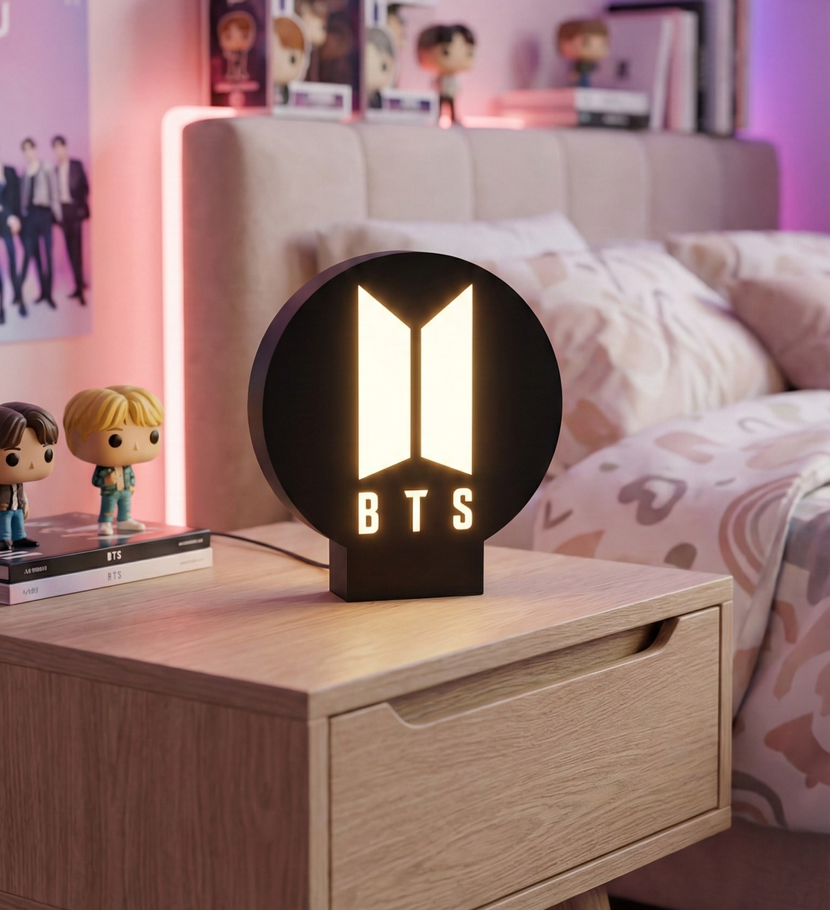 Iluminá tu espacio con este increíble Velador tipo lightbox LED de diseño exclusivo con el logo de BTS, fabricado con impresión 3D de alta calidad y materiales resistentes. Su acabado profesional y contraste hacen que luzca espectacular tanto encendida como apagada, perfecta para cualquier rincón Army.